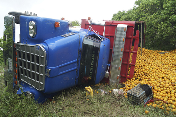 Vuelca camión cargado con cítricos