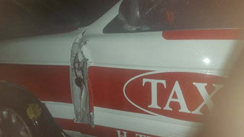 Al llegar al lugar, el personal policiaco acudió al lugar donde se entrevistó con una persona que se mostraba visiblemente ebrio y que había sido golpeado, además de que una unidad en su modalidad de taxi también presentaba daños considerables.