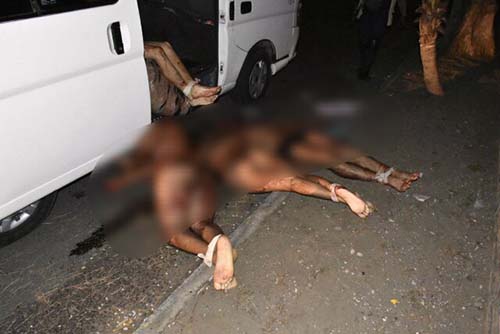 Fuera de la unidad, fueron hallados tres hombres y otra mujer, todos ellos estaban semidesnudos, sólo vistiendo ropa interior, amarrados de manos y pies, presentando huellas de violencia e impactos de bala.