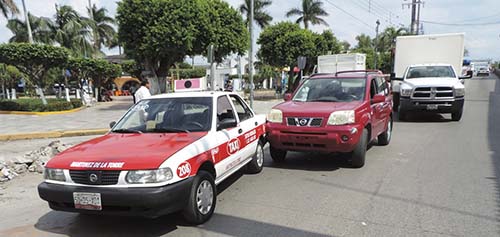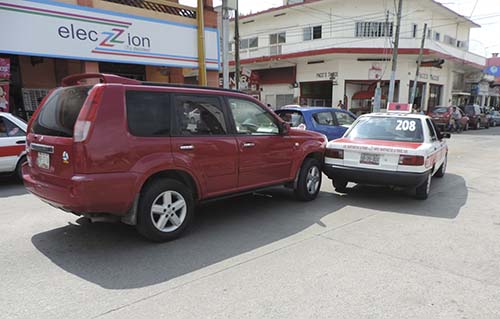 El accidente ocurrió cerca de las 15:50 horas en el crucero de Ávila Camacho e Hidalgo, por donde circulaba el taxi con placas de circulación 50 35 XDA del Estado, con número económico 208 del sitio Hidalgo, conducido por quien se identificó como Fernando Soto Franco, con domicilio conocido en la colonia Ejidal, quien al bajar la velocidad fue impactado en la parte posterior.