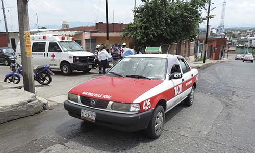 Martínez de la Torre, Ver.- Dos personas lesionadas fue el saldo de un accidente vial, esto luego de que la imprudencia al manejar por parte de un taxista, provocara que dos empleados a bordo de una motocicleta resultaran heridos al ser impactados por el ruletero.