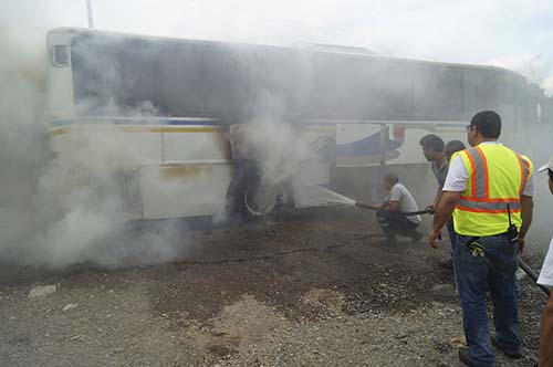 Acudiendo de manera rápida el personal de Protección Civil y Policía Municipal para sofocar el fuego que a pesar del uso de extintores nada podían hacer para evitar que el fuego avanzara hacia el motor y el interior de la unidad, pero por la falta del Cuerpo de Bomberos nada se podía hacer para sofocar el fuego.