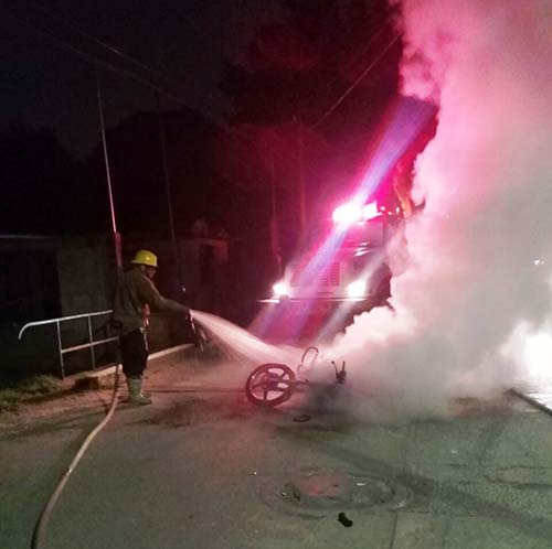 El suceso se registró al filo de las 01:00 horas, en la calle Niños Héroes, por donde una motocicleta de la marca Italika 150, comenzó a incendiarse, al no poder apagarla su propietario solicitó la presencia de los Bomberos a través del 911.