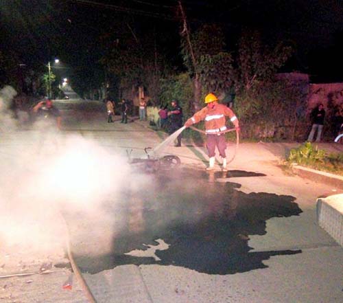 Al arribar al lugar, se encontraron con que una motocicleta, propiedad de Esteban Hernández Gerónimo de 34 años y vecino del municipio de Papantla, estaba siendo consumida por las llamas, luego de que tanto la unidad como su propietario fueran arrollados por una veloz camioneta, que tras el incidente se dio a la fuga.