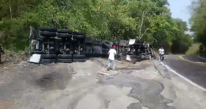 Una pipa de doble remolque que transportaba ácido fosfórico, volcó sobre un costado de la carretera federal 180, en el tramo Gutiérrez Zamora-Papantla, a la altura de la curva conocida como "La Camelia", confirmó el director de Protección Civil Municipal, Jacinto Pérez, quien se trasladó al lugar para atender la contingencia.